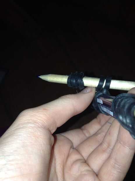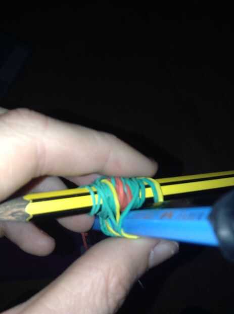 primero acaba de obtener cuatro lápices sin filo y sobre 6-7 ruberbands. Use cuatro del cortarla para pegarlas juntas como se muestra en la fotografía con los dos lápices conectados. Luego, hacer una "T" con los lápices y adjuntarlos junto con o