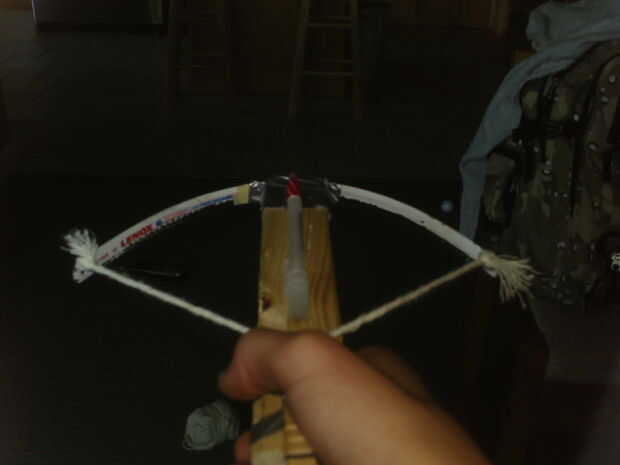 una ballesta de papel hecha de papel, palos de paletas, cinta y cuerda.Paso uno: toma una hoja de papel y enróllela alrededor de un lápiz, cinta adhesiva los extremos del papel para evitar que el rollo desenrollado. Cortar el rollo a la longitud dese