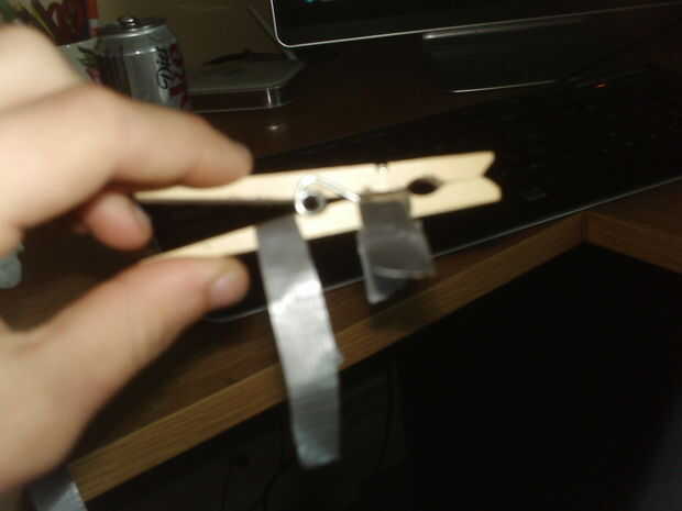 luego fije la cinta a la clavija de ropa así...
