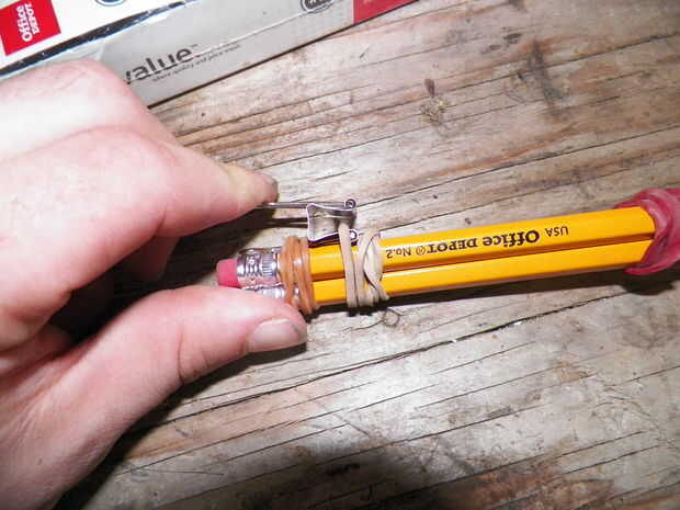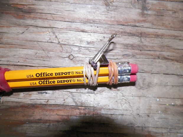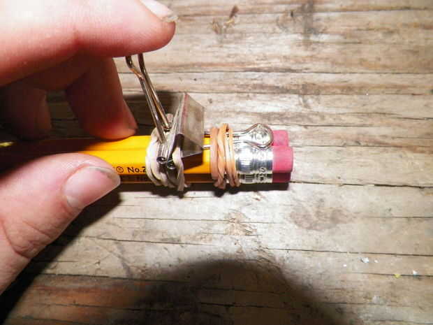 1. Abra el clip y deslícelo debajo de la banda de goma envuelta alrededor de la goma de borrar de los lápices, asegúrese de que el clip es en la parte superior los dos lápices que están separados en el otro extremo de la "cuerda de arco"