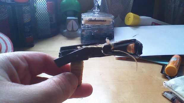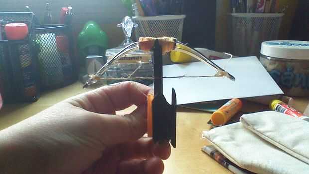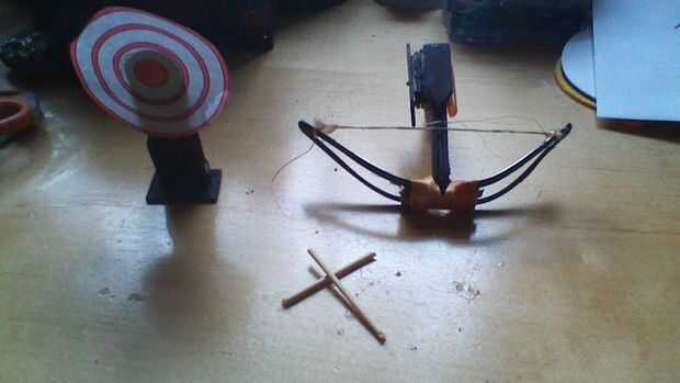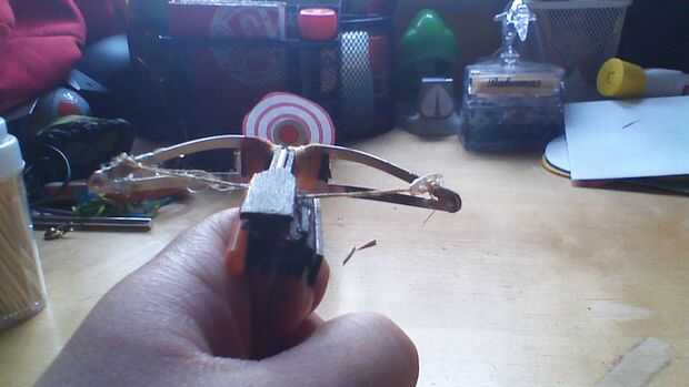 Una vez que haya terminado de construir la ballesta básica tomar tres pequeñas plazas de un palillo de arte y pegamento en torre entonces pegamento a la parte posterior y lado de la ballesta. Luego tome un pedazo más largo de un palo de arte con un lado inclinado en una curva como el final del palo de la embarcación y el otro plano. Tomar el pequeño clavo y clavo la paz más a la torre en el centro de la paz más larga para que la pieza más larga puede girar alrededor. Asegúrese de que cuando se carga la cadena y la pieza angular lo empuja hacia arriba la cadena se suelta de las muescas de la ballesta.