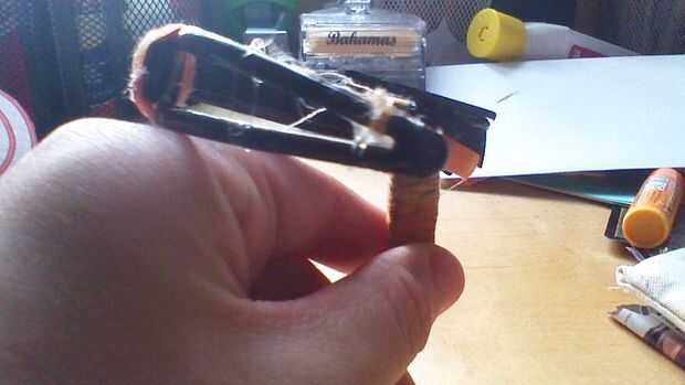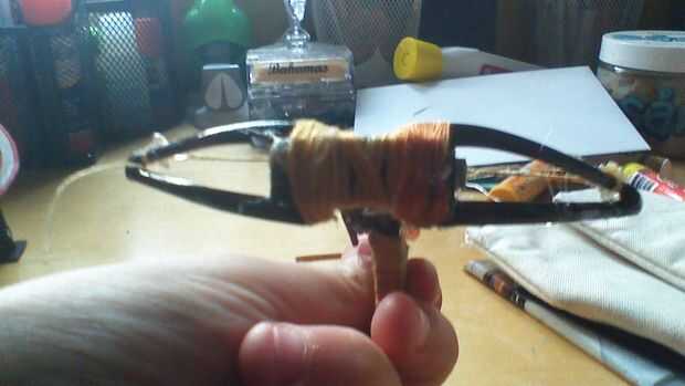 Para hacer el tornillo protector que asegura que la cadena no va sobre el perno cuando el perno se que llevas una pequeña plaza de palillo de arte y una paz más largo con un punto en un extremo. La plaza a la punta plana del pegamento y poner unos trozos de cinta en la parte inferior de la punta para asegurarse de que el perno no deslice luego pegue la Plaza detrás de la ranura para el hilo de bordar para que la flecha pasa por la muesca.