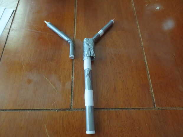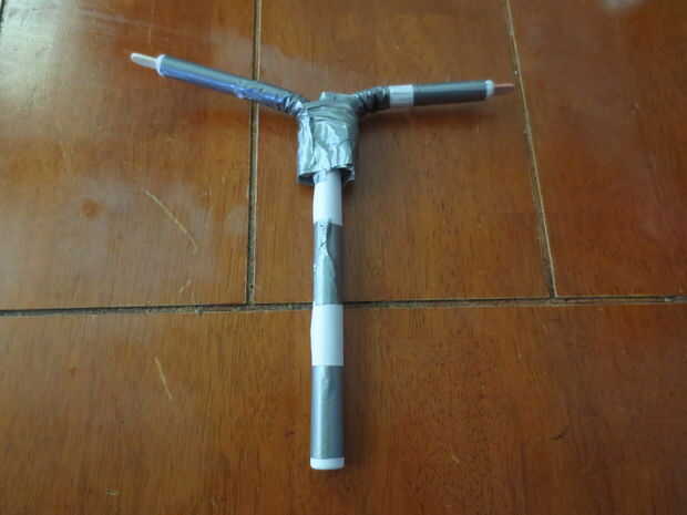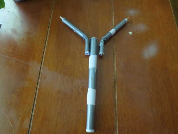 Para hacer el cuerpo de la ballesta, tome cinco hojas de papel y apilarlos, luego enrollar la pila y cinta adhesiva para que permanezca en. Ahora Alinee los brazos al cuerpo y con cinta adhesiva en. Me pareció útil hacer un brazo en un momento.