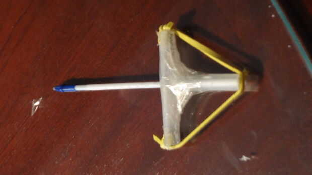 Ahora Coloque el lápiz en el orificio, tire hacia atrás de la goma y verlo volar.