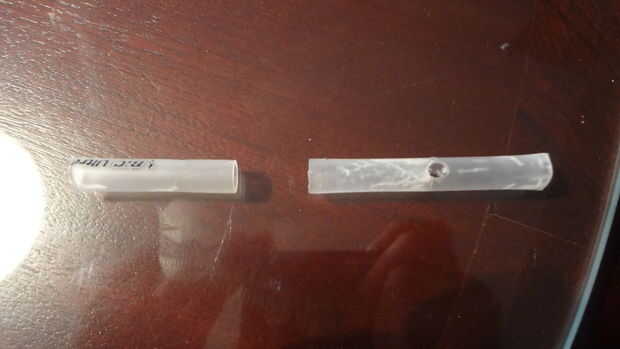 Ahora usted necesita tomar el cuchillo o la grapa de removedor y hágale un agujero a través de ambos lados de la mitad de la pieza más larga.