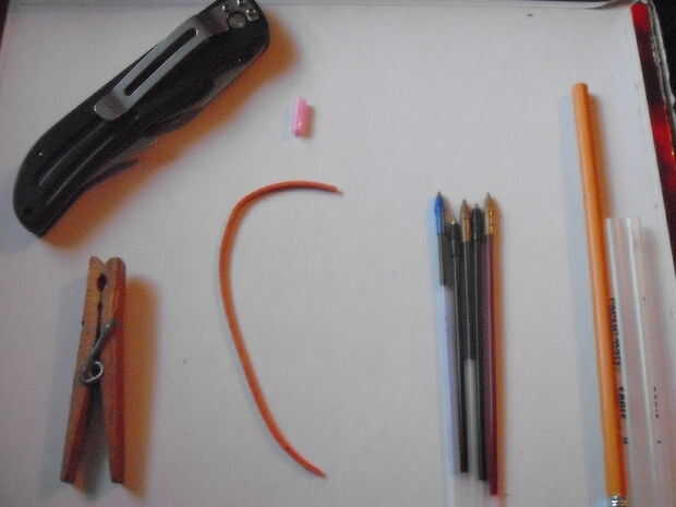Esto es casi lo mismo que los demás en este sitio con algunas modificaciones. Todo lo que necesita es tres bolis bic (el plástico blando arraigo unos funcionan mejor), un lápiz, una goma de la pieza 1/2 en más de sus plumas, una pinza, una sierra y cinta adhesiva. Separe las plumas antes de empezar.