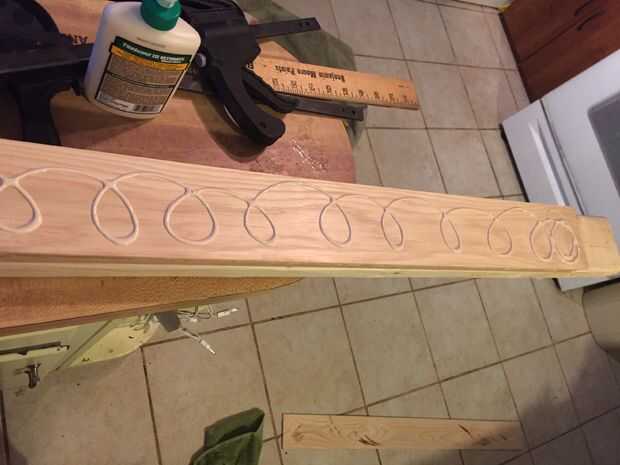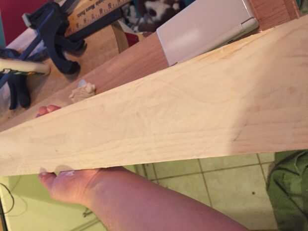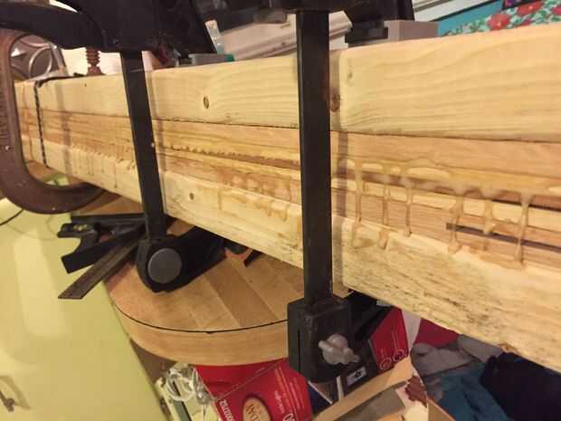 A continuación las tablas fueron enarenadas ligeramente en preparación para la laminación. Usé apretado enlace 3 para pegar todo junto. Después de aplicar cola a las capas frotis o el pegamento de la pintura para que cubra todo el tablero. Luego fije con abrazaderas. El más mejor! Yo no uso todas las debo tener. También se intercala entre algunos 2by4 chatarra para tratar de mantener una presión uniforme y apretadas.