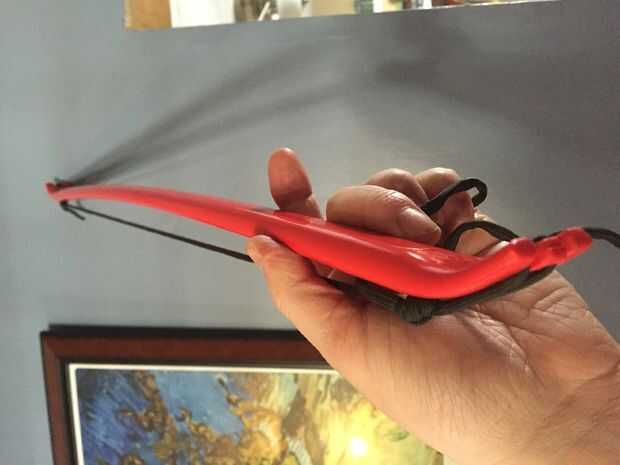 Se usó un cable para la picadura, esto es sólo temporal, como plan para atar una cuerda de arco verdadero en el futuro. Ató unas dos pulgadas más cortas el la punta.