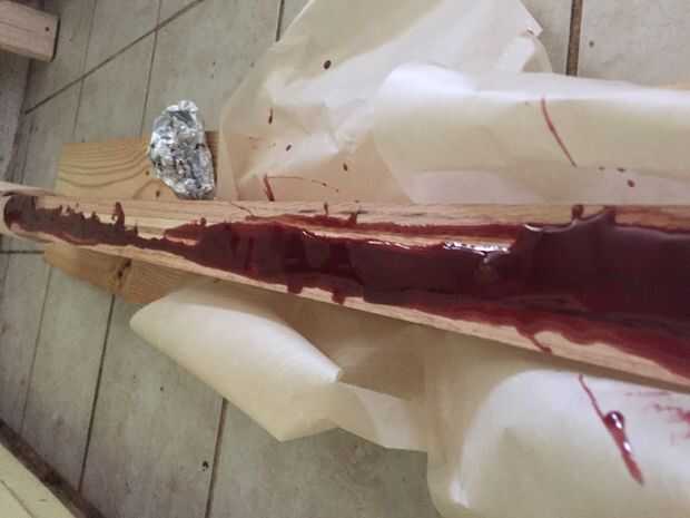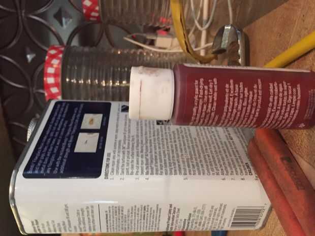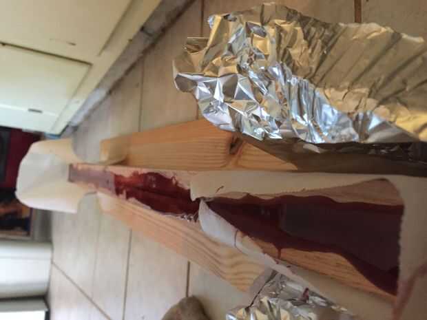 Antes de mezclar la resina pegado las juntas con papel de cera y papel para contenerla. Después de mezclar, he añadido un par de gotas de pintura acrílica roja para color.
