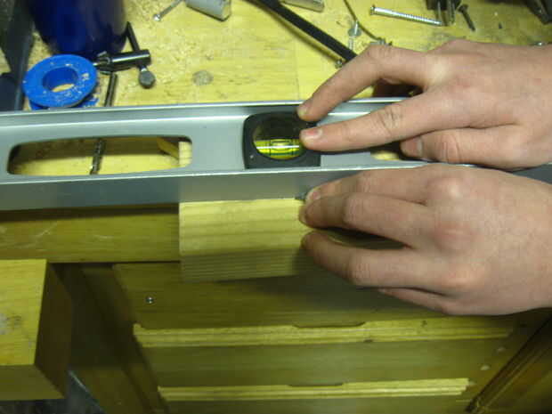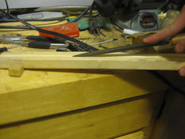 Ahora es el momento para hacer la ranura para el perno. Para esta parte necesitas un clavo afilado y algo con un borde recto como un nivel. La línea encima del nivel del sabio por lo que es recto y exactamente en el centro de la placa. (En la foto esto no es la tabla derecha sólo estoy demostrando la técnica.) Con su clavo hacer un rasguño profundo con varias pasadas por la Junta. Debe ser lo suficientemente profunda como para que pueda guiar su archivo. Ahora empezar a cavar con el archivo. Cavar un poco menos de la mitad un lápiz ancho profundo.