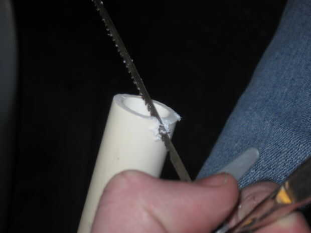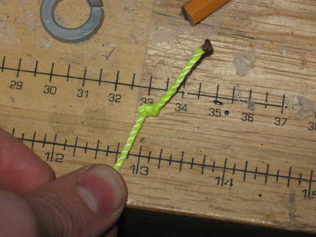 Quemar un extremo de la cadena que cuelga del carrete. Esto detendrá la cadena/cuerda se deshilache. Sólo use esta técnica en cuerda artificial, si es natural que se incendiara. Un doble nudo en el extremo de nuestra por el lugar que quemamos. Cortar la cadena a la longitud de la tubería y quemar el final de esto también. Deslice la cuerda en la ranura que hicimos en nuestra tubería de PVC para que el nudo sostiene en, (ver diagrama) nudo otra aproximadamente 1" debajo de la ranura en el otro lado de la tubería de PVC.