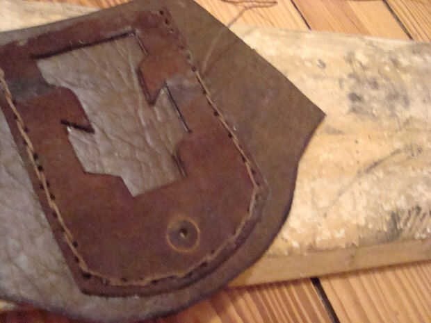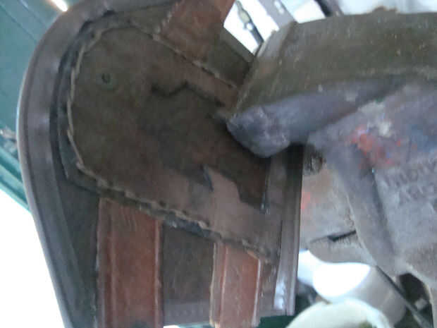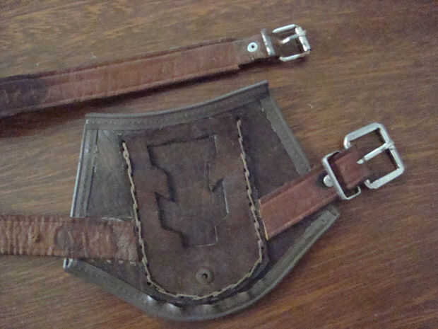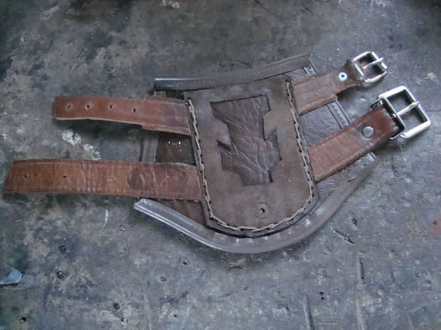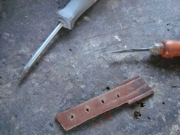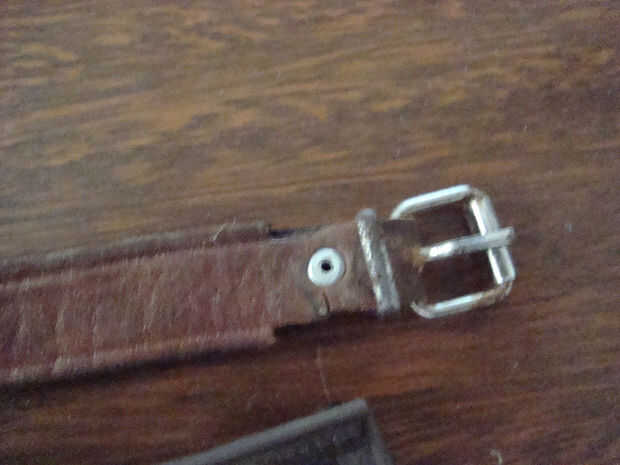 Con unas Leznas hice un par de agujeros y con el hilo fui modo las partes de cuero en su sitio. podemos usar algun collar de perros de cuero tengamos o quizas la hebilla de un cinturon de niños.
