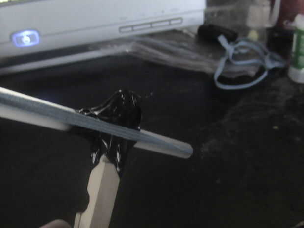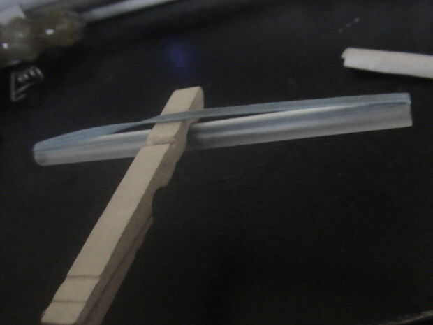 Inserte el pasador de ropa entre la banda y el tubo de la pluma que la primera muesca de la clavija de ropa se apoye sobre el tubo. luego de la cinta (y, sí, cinta, pegamento no esta vez, es realmente difícil trabajar con esta área (al menos lo fue para mí) pero puede llevar mejor si logras pegarla)