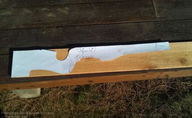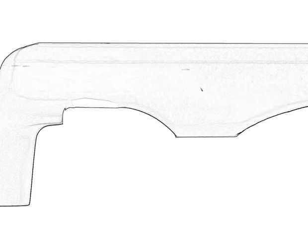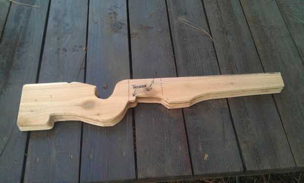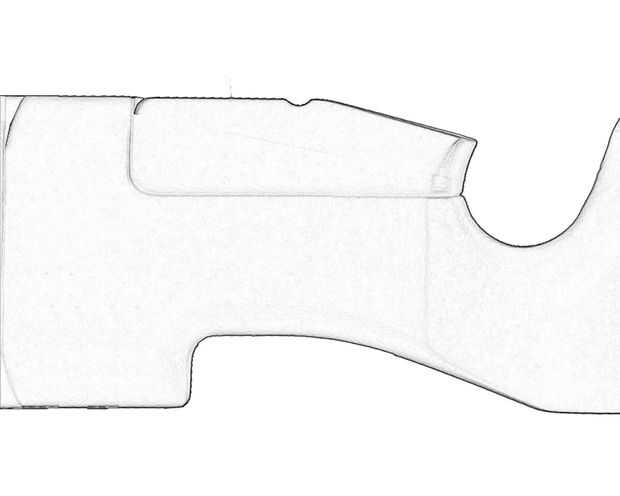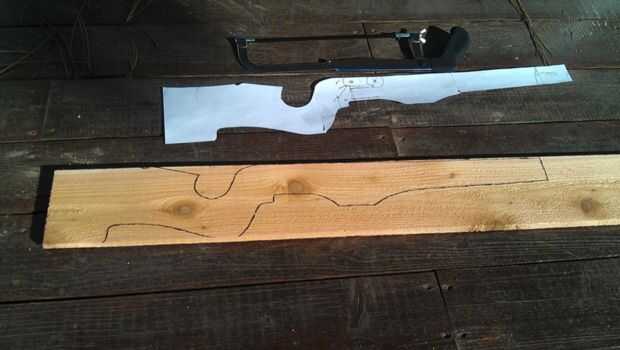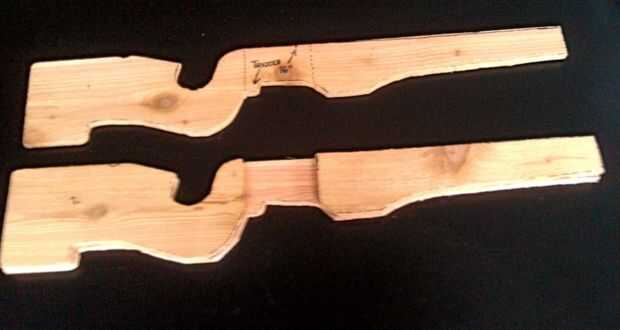 Imprima el diseño común y recórtalo. Luego trace a un pedazo de tablero común y recortarlo. Una sierra de banda sería lo ideal; sin embargo usé una sierra para metales y una escofina de madera ya que no tengo una sierra de banda. Probar la acción tomando nota de cómo se siente y haga los ajustes según sea necesario. Os pongo un pequeño ángulo positivo en la empuñadura para mayor comodidad. Una vez satisfecho, use este recorte como una plantilla para recortar dos acciones más. Sobre el stock medio necesita cortar una sección grande detrás del gatillo para liberar el mecanismo después de la cadena.