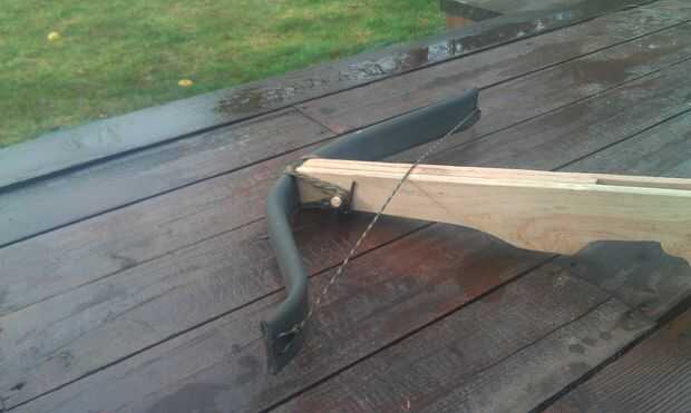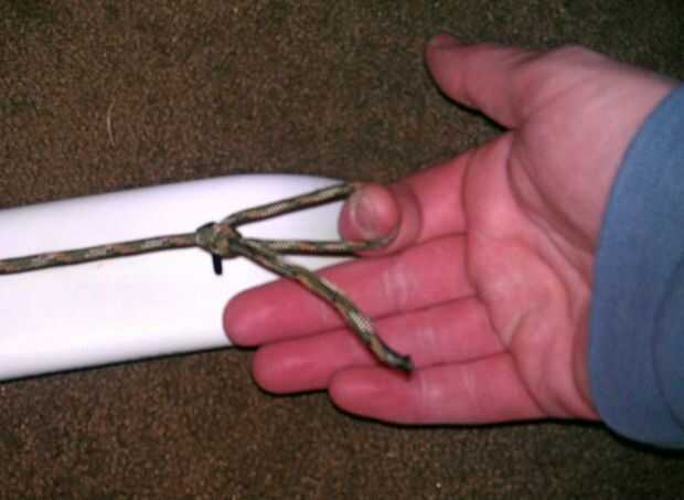 Para mantener el arco en lugar I orificio de 1/4" hasta el final de las acciones y martilló una longitud de 1/4" espiga varilla por el agujero. Entonces solía una longitud larga de paracord amarre con la varilla como un ancla. He utilizado primero un Nudo ballestrinque en la barra y procedió a enrollar hacia adelante y hacia atrás a través del arco. Finalmente terminé con un ballestrinque y metidos en la línea de exceso.