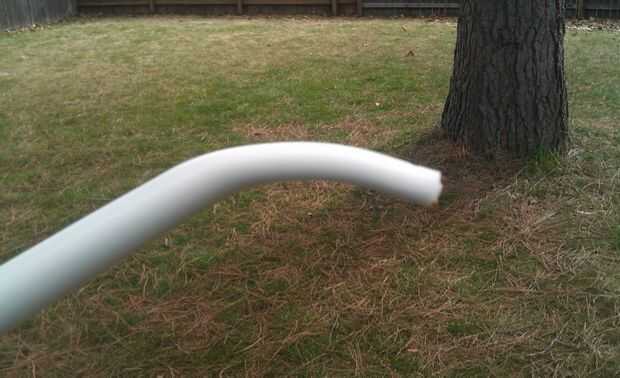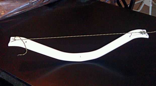 Para hacer el arco, usé un tubo de 1 1/4" PVC y corte a 32". Hacer tres marcas, una en el centro (16"), y dos marcas una pulgada hacia fuera de ambos lados del centro. Para dar un sutil tu arco cono hacer un jig aplanando con un pie dos 2 x 4 y dos piezas de 1" bloques en las esquinas de un extremo. Calentar el tubo con una pistola de calor hasta que sea flexible, luego use la plantilla para aplanar que tamaño, de un lado a la vez. Aplanar un extremo apretando el tubo entre una plana 2 x 4 y su plantilla, con los bloques 1" entre la marca y la marca de 15". Los tableros de la abrazadera hacia abajo y permita que el tubo se enfríe antes de soltar las abrazaderas. Hacer esto a ambos lados. Esto crea la forma adecuada (aviso de ambos extremos son planos, y el centro tiene de profundidad con un lado plano).