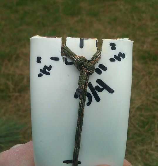 Las muescas de la cadena que hice tiene un espacio de 3/4" entre ellos. Marque el centro del ancho del arco y hacer dos marcas en 3/8" de la marca. Ahora corte las muescas con una sierra. Una vez que tengas las muescas cortadas te pueden dar la proa su curva adecuada. Atar un pedazo de paracord en el arco, luego calentar el centro del arco y jale hacia arriba la cuerda hasta que el arco viene en forma. Mantenerlo en su lugar hasta que se enfríe. Entonces usted puede cortar su cable de final y la cadena tu arco. Usé dos nudos as de guía a la cadena para arriba. En este momento aproveché para pintar el arco. No es necesario, pero me gusta la forma de camuflaje se ve en blanco.