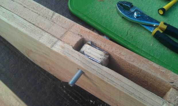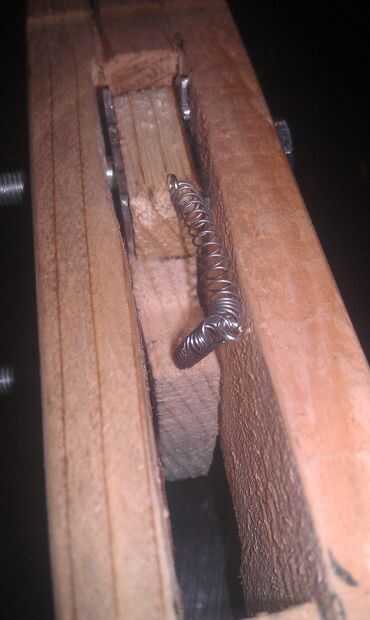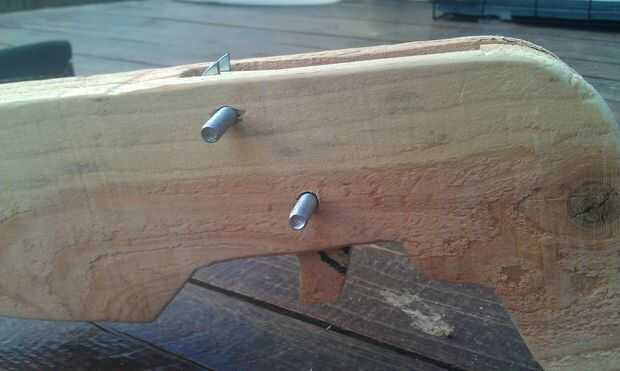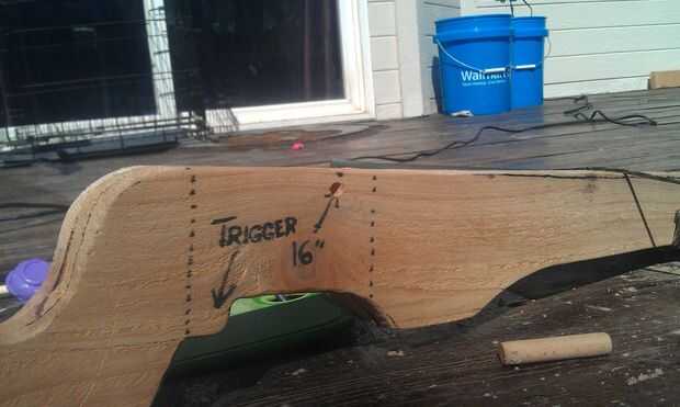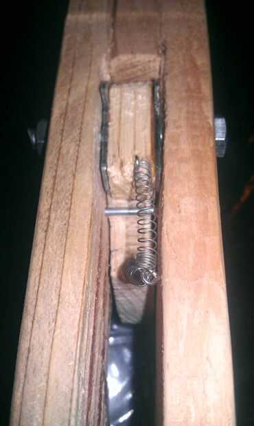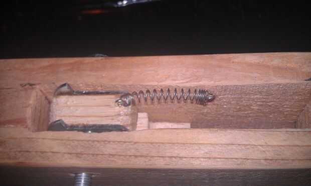 Los elementos del sistema de disparo incluyen el gatillo sí mismo, y la cerradura de cadena del engranaje. Hice el gatillo de un pedazo de madera. Corte la forma general y una escofina de madera y papel de lija para los detalles de la manera. El gatillo pivota sobre un perno y es el resorte para que vuelva a la posición después de que se tiró.