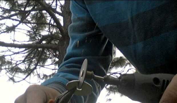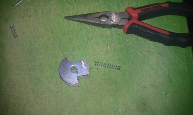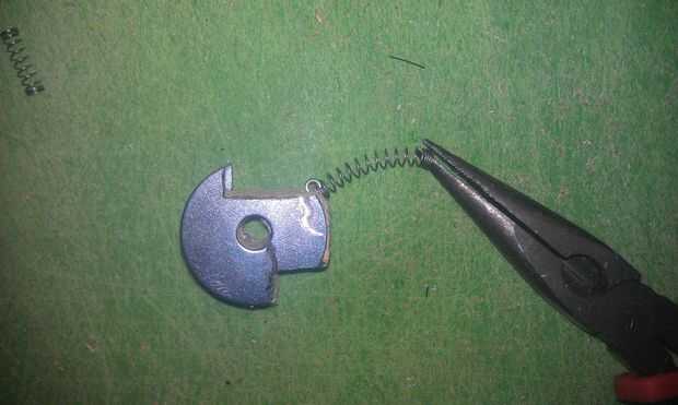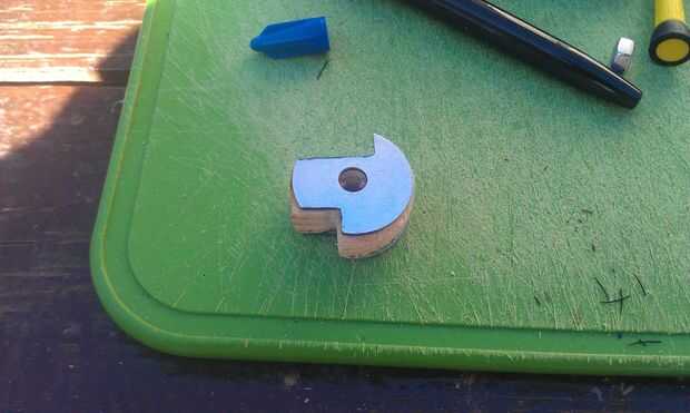 El engranaje de cierre está hecho de un pedazo de madera entre dos arandelas. Las arandelas se cortan en la misma forma. Usé una dremel y un disco de corte metal para cortar las arandelas. Asegúrese de que utilizar seguridad adecuado las precauciones cuando corte metal. Las chispas volarán así que use guantes, protección auditiva y protección para los ojos. No corte METAL sin gafas. Después de que las arandelas y la madera se cortan a la medida, utilizar pegamento para enlazarlos juntos. El equipo es similar al gatillo que rota en un perno y regresa con la ayuda de un resorte.
