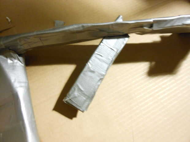 Para el gatillo, cortar un disparo de cartón que es cerca de 13 por 3 cm. Corte una pieza triangular y luego cubrir de cinta aislante. Corte un agujero en el barril, donde el alcance elástico es más lejano, e inserte.