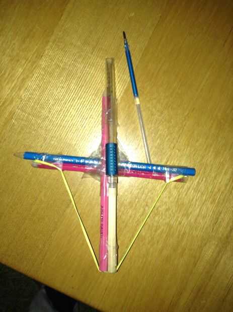 este es un divertido pero ballesta lápiz eficaz que es barato y fácil de hacer.Paso 1: Lo que se necesitaPara esta ballesta necesita:4 lápices1 banda de caucho1 cierre pegy algunos cinta aislante.Para la munición tendrá un lápizPaso 2: Hacer la balle