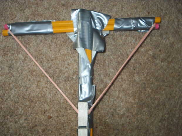 se trata de una ballesta bastante eficaz que dispara el 15-20 pies con una velocidad bastante rápida para su construcción.Paso 1:Paso 2: a empezar pone dos lápices al lado del otro. Luego tomar el otro lápiz y centro en el medio de los otros lápices.