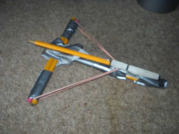 se trata de una ballesta bastante eficaz que dispara el 15-20 pies con una velocidad bastante rápida para su construcción.Paso 1:Paso 2: a empezar pone dos lápices al lado del otro. Luego tomar el otro lápiz y centro en el medio de los otros lápices.