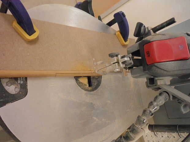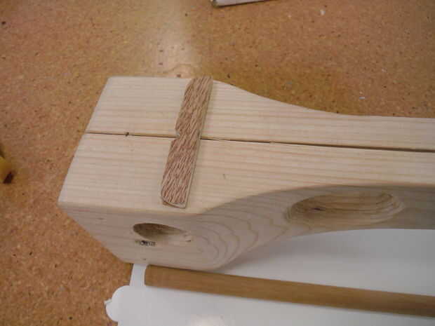 En este punto tomar un pedazo de madera contrachapada fina sobre la anchura de la ballesta en el extremo de proa y poner una muesca en ella. (ver fotos) este pegamento en una ranura poco profunda para tomarlo. La punta del perno se reclinará sobre esto como la parte final en la muesca. Esto reduce la fricción y elimina la necesidad de cortar un canal para el tornillo en la parte superior. Algunas ballestas tenían esta característica que algunos tenían un canal de corte.