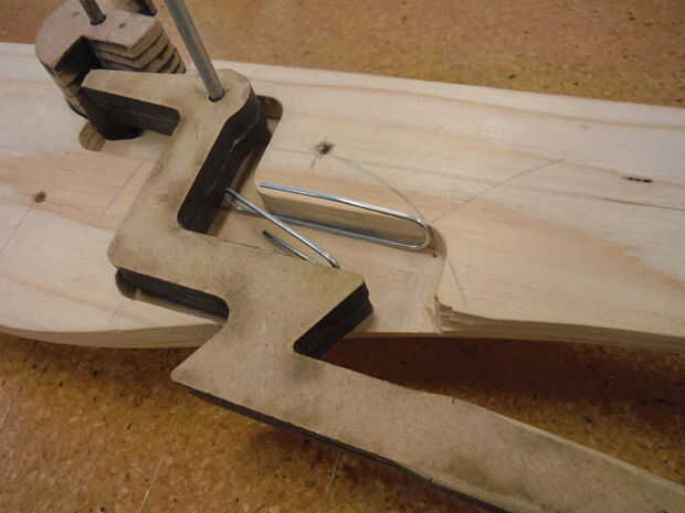En esta etapa, verificar el ajuste y la función de la tuerca de la leva y gatillo Asamblea utilizando sólo la mitad de la caña del timón y dos clavos 12D. Simular la tensión de la cuerda con el dedo, deben moverse libremente sin complejos. Arena, archivo y corregir cualquier problema ahora, cuando el gatillo está en el lugar permanentemente. El gatillo tiene un resorte, a la fuerza que hacia abajo en todo momento y ayuda en la carga de la ballesta. He utilizado un clip grande abierto (ver imágenes) pero no demasiado fuerte hace el trabajo muy bien. Alternativamente un trozo de metal de flejado de palets de banda sería mejor, pero no pude encontrar alguna colocación alrededor. En la práctica, después de disparar la ballesta, la cam fue girada en el lugar a mano y el resorte se establece automáticamente la punta del gatillo en el lugar adecuado, en la tuerca de la leva superficie sustentadora.
