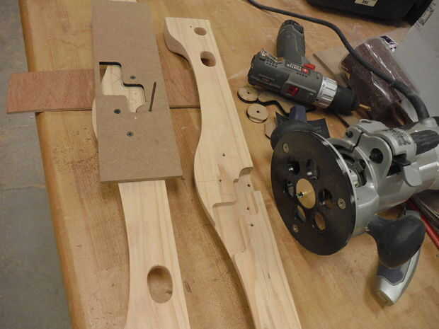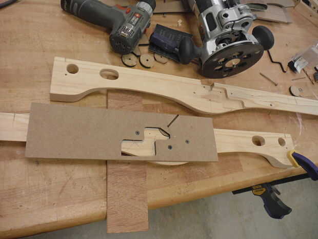 Mientras que la acción todavía no se forma es más fácil usar la plantilla para cortar el hueco de disparo. Atornille el patrón con los tornillos pequeños en los agujeros previstos. Usar un router de mano y pequeño patrón bit y un anillo espaciador de la placa de router diseñada para "Hacer el signo" de esa manera que la broca se ejecutará a lo largo del borde de la plantilla corte una hendidura perfecta. Usé un poco ¼ y espaciador adecuado. Puede practicar un poco para determinar la profundidad adecuada para la broca, así como la dirección de avance. El gatillo debe ser libre de movimiento pero no descuidado, o afecta la geometría del mecanismo de liberación. (No cortó el hueco hasta que después de formar, pero se dio cuenta es más fácil de la posición, fijación y forma más robusto para cortar antes de que se forma la acción.)