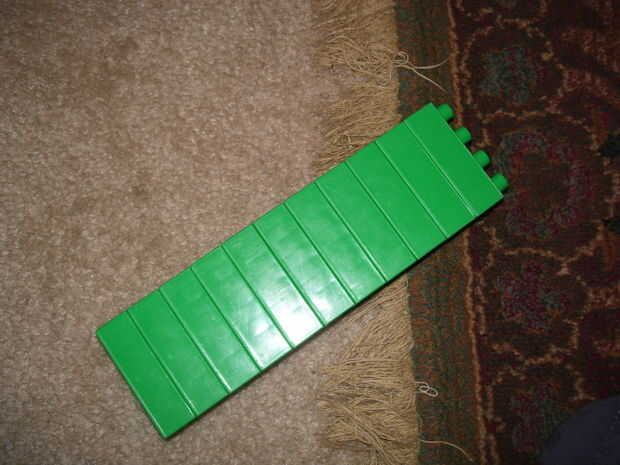 Primero hacen un montón de 11 ladrillos de 4 x 2.  Luego, agregar tres 4x2s más de un color diferente (yo usé rojo).  En el extremo trasero utilice dos 4x2s azul para que una sola fila de 4 sobresale de la parte superior e inferior.