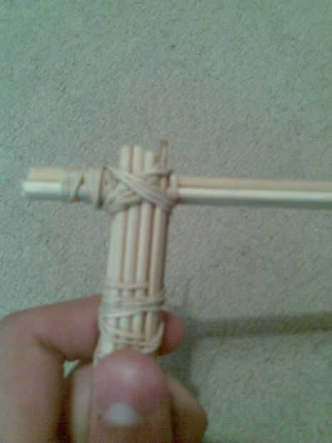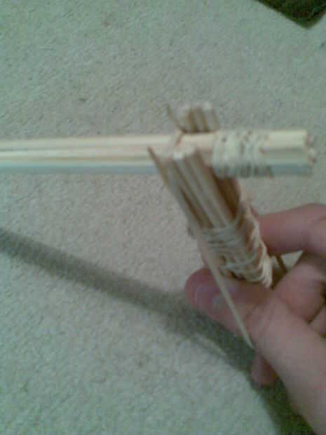 Acaba de tomar su manivela completa (comprueba que has hecho bien) e instálelo en el resto del cuerpo como en la foto. Asegure con gomas pero asegúrese de mantener un espacio entre las puntas de los 2 palillos y el resto del mango. Para ello, sólo tiene que colocar la goma como se muestra.