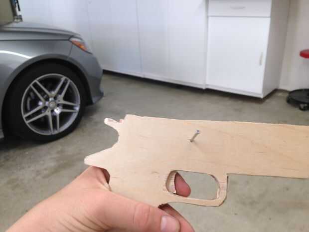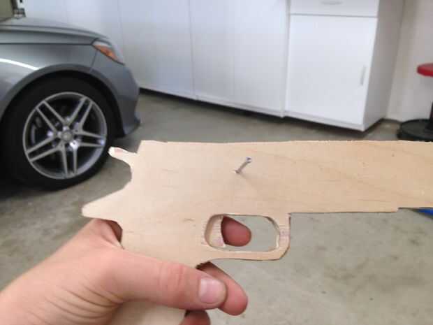 esto es técnicamente una ballesta, pero se utiliza como una pistola. Es una ballesta porque hay no hay ram, pero hay un disparador. Es potente con una banda de goma - rango máximo de 15 a 20 pies, alcance de 10 pies. Por rango efectivo me refiero a l