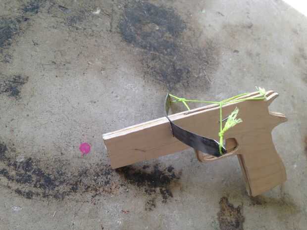 esto es técnicamente una ballesta, pero se utiliza como una pistola. Es una ballesta porque hay no hay ram, pero hay un disparador. Es potente con una banda de goma - rango máximo de 15 a 20 pies, alcance de 10 pies. Por rango efectivo me refiero a l
