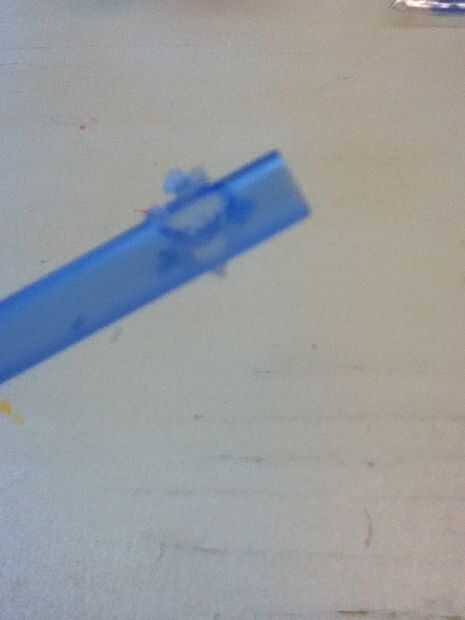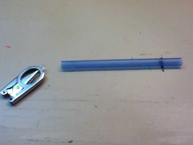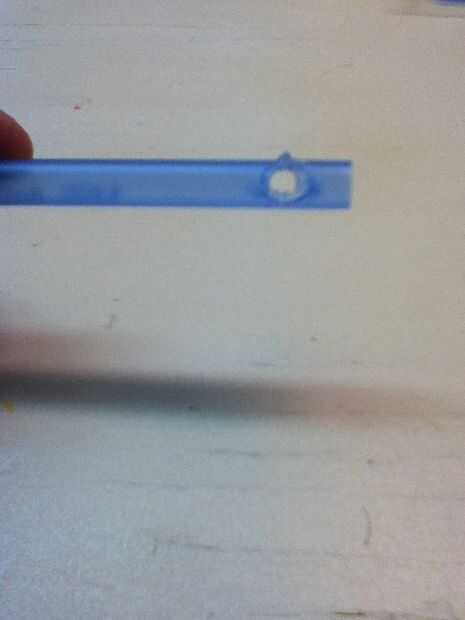 Vas a tomar el tercer tubo de pluma desechables (base) y perfore un agujero lo suficientemente amplia como para adaptarse a la pieza cortada de G2 cartucho. Tiene que ser lo suficientemente apretada como para mantener en su lugar, pero lo suficientemente suelta para tirar de ella cuando quiere contraerlo. Se puede utilizar un taladro, tijeras, un destornillador o algo más fuerte.