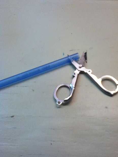 doblado Sierra utiliza plantilla hoja de sierra, un remache pop con arandelas y una tira de nylon u otro plástico duro.Paso 1: Cortar el mango. Una ranura de la cuchilla de la sierra (Nota: ranura no pasa por la parte posterior del mango).Paso 2: Gui