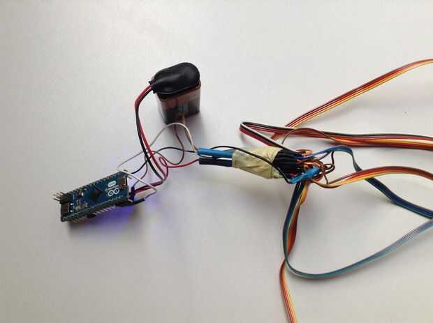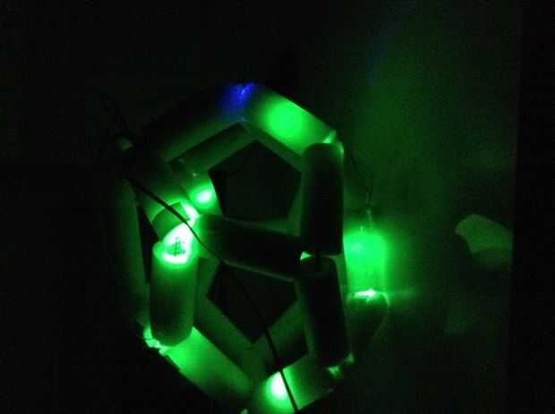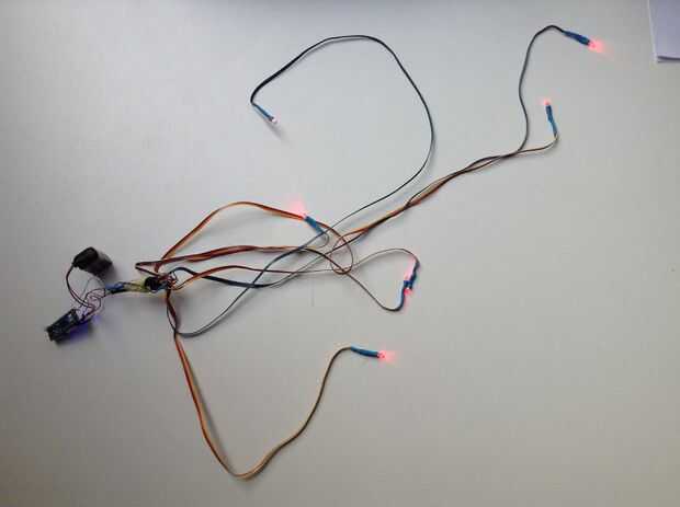 Una vez hecha la forma, podemos empezar a poner en el cableado y la electrónica. Cortamos pequeños agujeros en el tubo para empujar los LEDs a través de. También es conveniente poner el Arduino y la batería cerca de las aberturas.