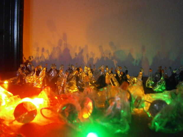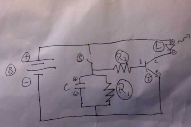 La idea básica era tener un interruptor de inclinación de bola rodante que generalmente en la posición de apagado (celebrado en esa posición por la forma del error y el peso de la batería en la parte inferior), pero cada vez que se volvió o se golpean, el interruptor iría y cargar un pequeño circuito RC con un plazo de unos pocos segundos. Ese circuito RC controla un transistor que a su vez, gestiona un pequeño LED. El resultado final es un pequeño circuito de LED que se enciende cuando se golpea y luego se descolora hacia fuera a oscuras durante unos segundos. Cada uno cuesta aproximadamente $1,50 en partes.
