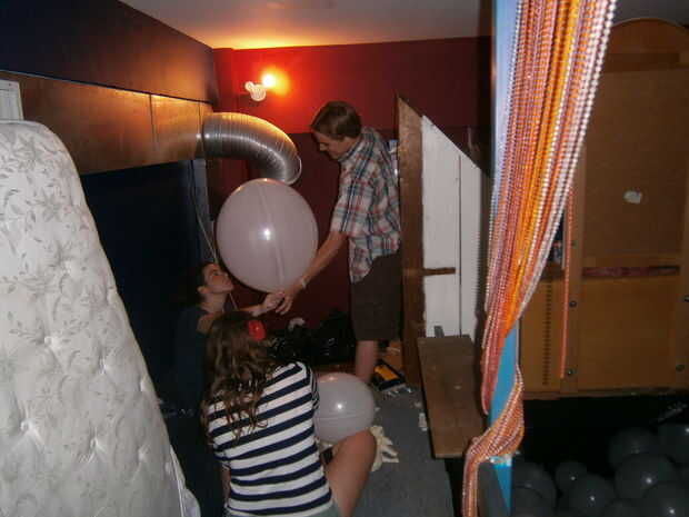 Utilizar un compresor de aire pequeño para inflar, tus pulmones te lo agradecerán para él. La vinculación es obviamente muy mano de obra intensivos otra vez así que invita a sobre un montón de amigos! Tuvimos una pequeña línea de montaje de inflar y atar que funcionó muy bien. Estar dispuestos a oler un montón de látex...