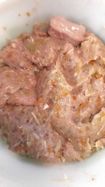 Corte algunos compuestos aromáticos y de temporada. En este caso (invierno) manzana, cebolla, zanahoria y champiñón. Los compuestos aromáticos del sudor hasta que estén tiernas y la cebolla a translúcido. Hacer puré la carne de pollo del muslo y la pierna en un procesador de alimentos, molino o picadora de buffalo y luego mezcle con los aromáticos cocinados. Agrega una cucharadita de sal, pimienta, semilla de mostaza de la tierra y tostado de semilla de hinojo para condimento. Guardar en la nevera.