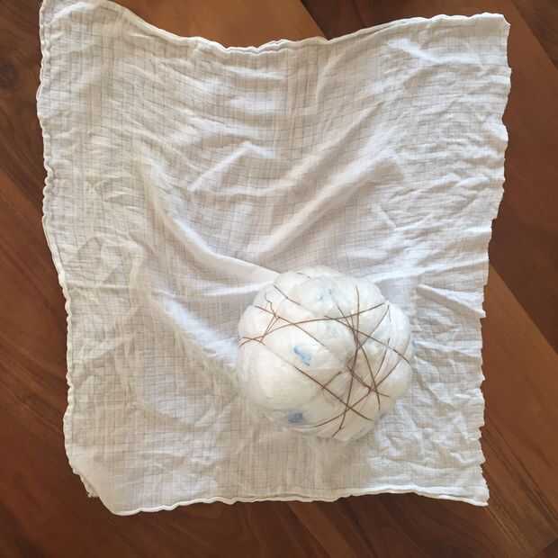 Coloque la bola en el centro de la tela. Envuelva una esquina sobre la bola y remeterlo por debajo de la bola. Hacer lo mismo con la siguiente esquina. El último rincón debe colocarse sobre las dos primeras esquinas. Después de haberlo hecho, fije la tela en su lugar con cinta de algún pintor.