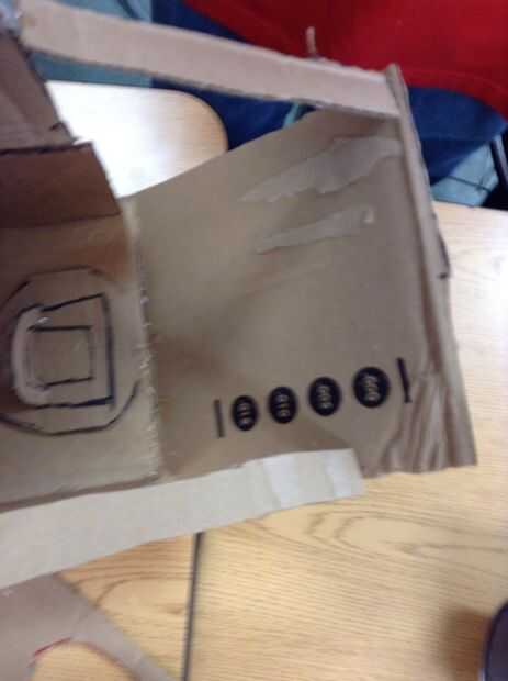 Cómo lo hicimos:Cartón y montones y montones de cinta! Cada uno comenzamos con una caja grande de cartón y pegadas sobre cartulina más para conseguir la forma correcta, tamaño y detalles. Rebanó la ventanas en 3 lados, aerosol pintado, entonces comen