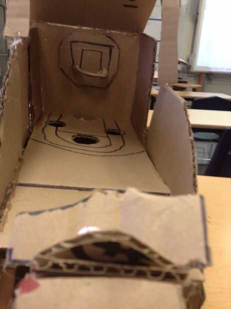 Cómo lo hicimos:Cartón y montones y montones de cinta! Cada uno comenzamos con una caja grande de cartón y pegadas sobre cartulina más para conseguir la forma correcta, tamaño y detalles. Rebanó la ventanas en 3 lados, aerosol pintado, entonces comen
