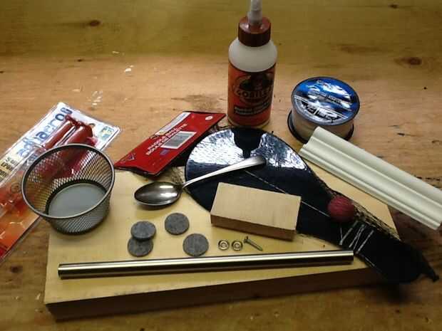 Necesita una base, te sugiero algo con masa como un trozo de 2 x 6 (50x150mm) sobre 12"(30cm) largos, algunos pinos de chatarra y un trozo de moldura biselada como silla. Los otros elementos se pueden encontrar en su tienda local de dólar. Conjunto bate una pelota infantil, un trozo de tubo redondo o pasador (yo usé la barra de cortina), algunos sedal pesado y una cesta pequeña como la clase que mantiene elásticos o clips de papel. Cuatro palillo no desgaste en pastillas va a venir bien. RAID el cajón de cubiertos de la abuela para una cucharadita robusta. No una barata y flexible. Haz unos pequeños tornillos para madera y una arandela y también necesitarás epoxy y pegamento de madera. Y ni que decir tiene, herramientas.
