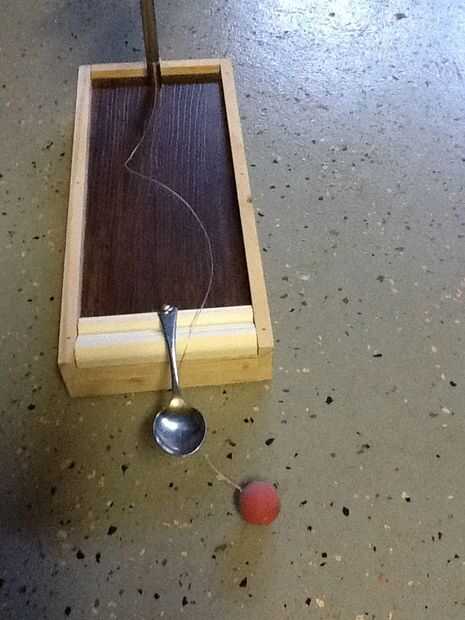 Pase el sedal por el agujero en la bola y poner un poco de epoxi sobre él para evitar que se tire. Ate el otro extremo a través del orificio en el post. Utilice un buen nudo para no soltarse. La cadena debe ser lo suficientemente largos para que la bola se encuentra en el cuenco de la cuchara y tiene un poco de holgura.