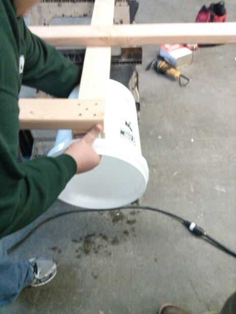 Coloque un balde de 5 galones sin la tapa puesta cerca de la esquina de la 5' Junta, asegúrese de que el cubo está mintiendo en su lado y orientado paralelo a la Junta de 5'. (Nota: tiene la boca del cubo mirando hacia afuera)