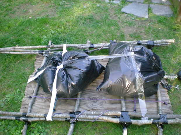 Obtener dos bolsas de basura llenas de latas de refresco, botellas de agua, 2 litros, jarras de leche, globos, etc.. Después se recogen dos bolsas pato cinta superior cerrada. Luego voltear la balsa y conecte las bolsas uno en la delantera en la parte posterior. Para atacar sólo uso mucha cinta de pato.