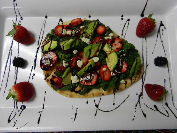 Precalentar el horno a 350 grados F. En una bandeja para hornear o (en micowave durante 20 segundos), añadir el pan plano y el calor hasta que el pan se calienta y suavizado. Sobre el pan plano caliente, añadir las espinacas, fresas, queso feta y aguacate. Rociar con el glaseado de balsámico.
