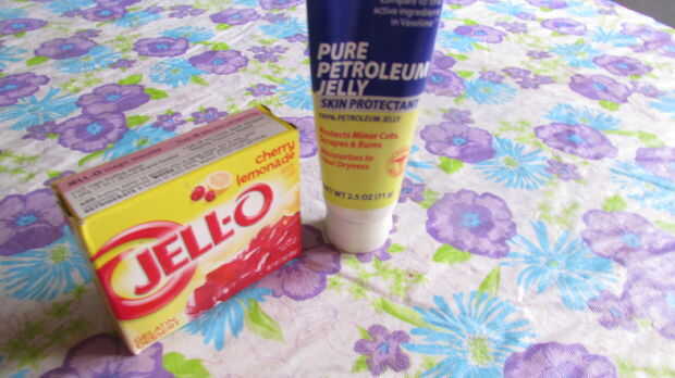 para el bálsamo para los labios se necesita: cualquier sabor de gelatina (yo escogí Limeade de cereza) y la jalea de petróleo fuentes: olla, cuchara, recipiente y cucharón suministros extras; pegamento de pistola y knick knacks