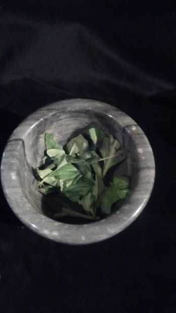 A continuación machacar y machacar en unas diez ramitas de albahaca en el jugo de limón. Albahaca tiene algunos muy interesantes cualidades de adormecer y es una adición perfecta a nuestro bálsamo.